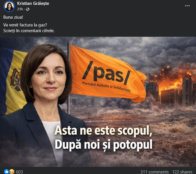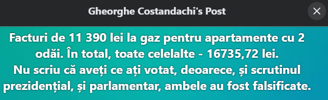 Și propagandistul Gheorghe Costandachi a intrat în cursa „a cui factură e mai mare”, afirmând că oamenii ar fi primit facturi de peste 11.000 de lei pentru încălzirea unor apartamente cu două camere. Costandachi nu prezintă nicio dovadă, dar a amintit cu această ocazie că alegerile prezidențiale și cele parlamentare au fost „falsificate”, narațiune demontată anterior de portalul nostru.