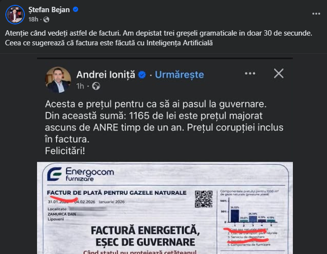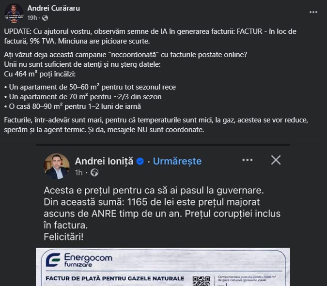 „Acesta e prețul pentru ca să ai pasul la guvernare”, a scris Andrei Ioniță, care și-a însoțit mesajul cu o factură Energocom suspectată că a fost generată de inteligența artificială (IA).