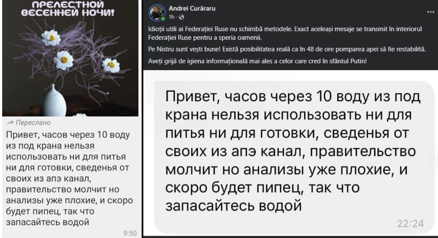 Un alt zvon a circulat începând cu 17 martie pe aplicația Viber. Un mesaj alarmist în limba rusă, transmis mai multor utilizatori din R. Moldova, îi anunța că „peste 10 ore” (în original: «часов через 10») apa nu va mai fi bună de folosit.