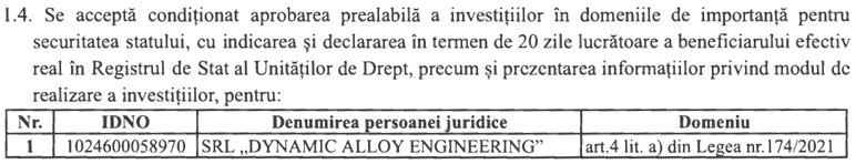 Într-adevăr, la 13 octombrie 2025, Consiliul pentru Examinarea Investițiilor de Importanță pentru Securitatea Statului a acceptat condiționat aprobarea prealabilă a investiției pentru compania SRL Dynamic Alloy Engineering, solicitând declararea beneficiarului efectiv real și prezentarea informațiilor privind modul de realizare a investițiilor. Cu toate acestea, investitorul nu a obținut licența de activitate necesară pentru a începe activitatea.