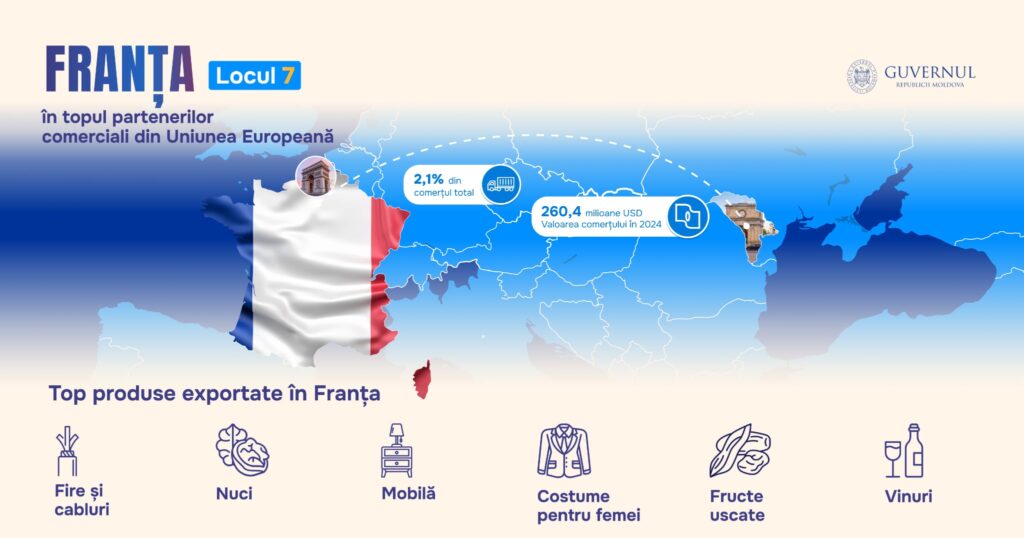 Potrivit Ministerului Dezvoltării Economice și Digitalizării, Franța este pe locul șapte în clasamentul celor mai importanți parteneri comerciali ai R. Moldova din Uniunea Europeană.