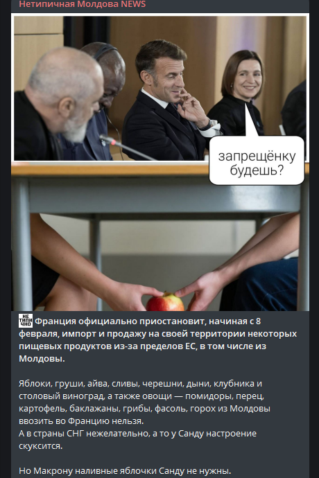 Știrea a fost distribuită pe Facebook, fiind preluată și de alte site-uri. De ocazie au profitat și unele surse pro-Kremlin, care au dezinformat că Franța va interzice importul mai multor produse din R. Moldova și că „Macron nu are nevoie de merele suculente ale Maiei Sandu”. Au dezinformat cu intenție și unele conturi de pe rețelele de socializare.