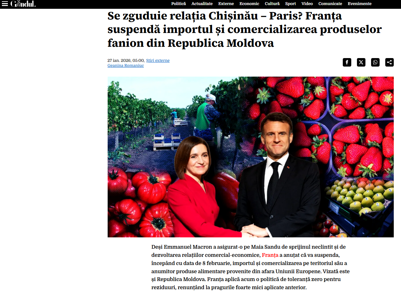 Pe 26 ianuarie, Gandul.ro a publicat un articol intitulat „Se zguduie relația Chișinău – Paris? Franța suspendă importul și comercializarea produselor fanion din Republica Moldova”, în care se sugerează că decizia autorităților franceze ar fi îndreptată împotriva Republicii Moldova, „deși Emmanuel Macron a asigurat-o pe Maia Sandu de sprijinul neclintit și de dezvoltarea relațiilor comercial-economice”.