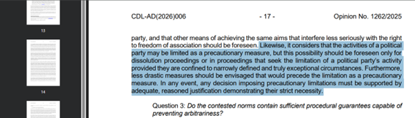 Венецианская комиссия утверждает, что деятельность политической партии может быть ограничена в качестве меры предосторожности, но такая возможность должна быть предусмотрена только для процедур роспуска или в процедурах, направленных на ограничение деятельности политической партии, при условии, что они ограничены узко определенными и действительно исключительными обстоятельствами. «В любом случае, любое решение о введении ограничений в качестве меры предосторожности должно быть подкреплено адекватным, обоснованным объяснением, демонстрирующим их строгую необходимость», - говорится в заключении.