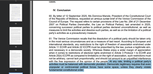 В своем заключении, Венецианская комиссия излагает позицию о том, какими принципами следует руководствоваться при ограничении деятельности партий, однако не выносит вердикт относительно того, что деятельность конкретных партий Молдовы была ограничена с нарушением или без нарушений закона. В документе не упоминаются ни партия INIMA Moldovei, ни партия Шор, и не говорится о «политической дубинке против оппозиции». Также, в заключении Венецианской комиссии, на которое ссылается Ирина Влах и другие источники, в том числе аффилированные беглому олигарху Илану Шору, не анализируется роспуск партии Шор (признана неконституционной в июне 2023 года).