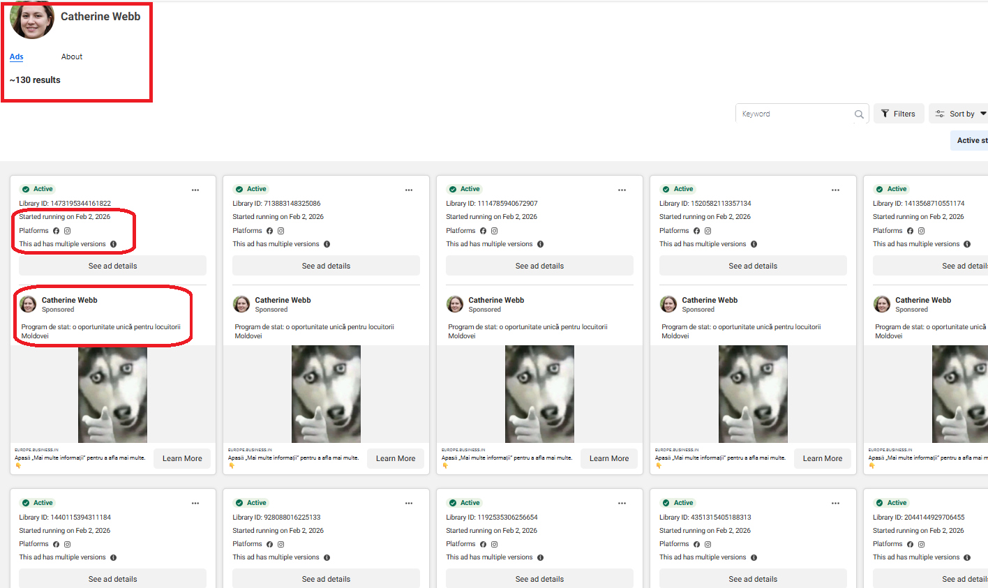 Biblioteca de reclame ale unor conturi care sponsorizează escrocheriile respective arată existența, în prezent, a sute de reclame înșelătoare care rulează pe Facebook și Instagram.