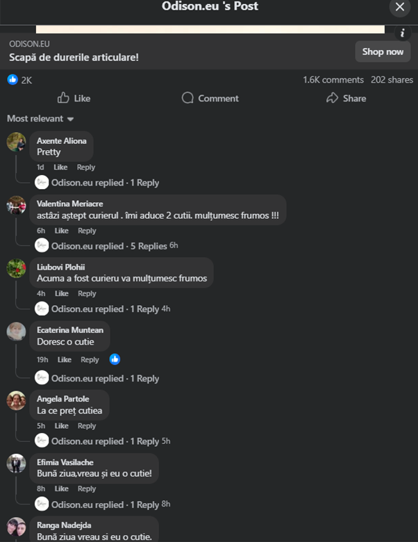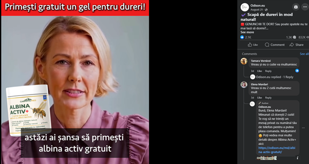 Cu toate acestea, produsele au fost comandate de mii de oameni. Judecând după miile de comentarii și reacții de pe mai multe postări sponsorizate, preparatul Albina Activ+ s-a bucurat de succes pe rețelele de socializare.