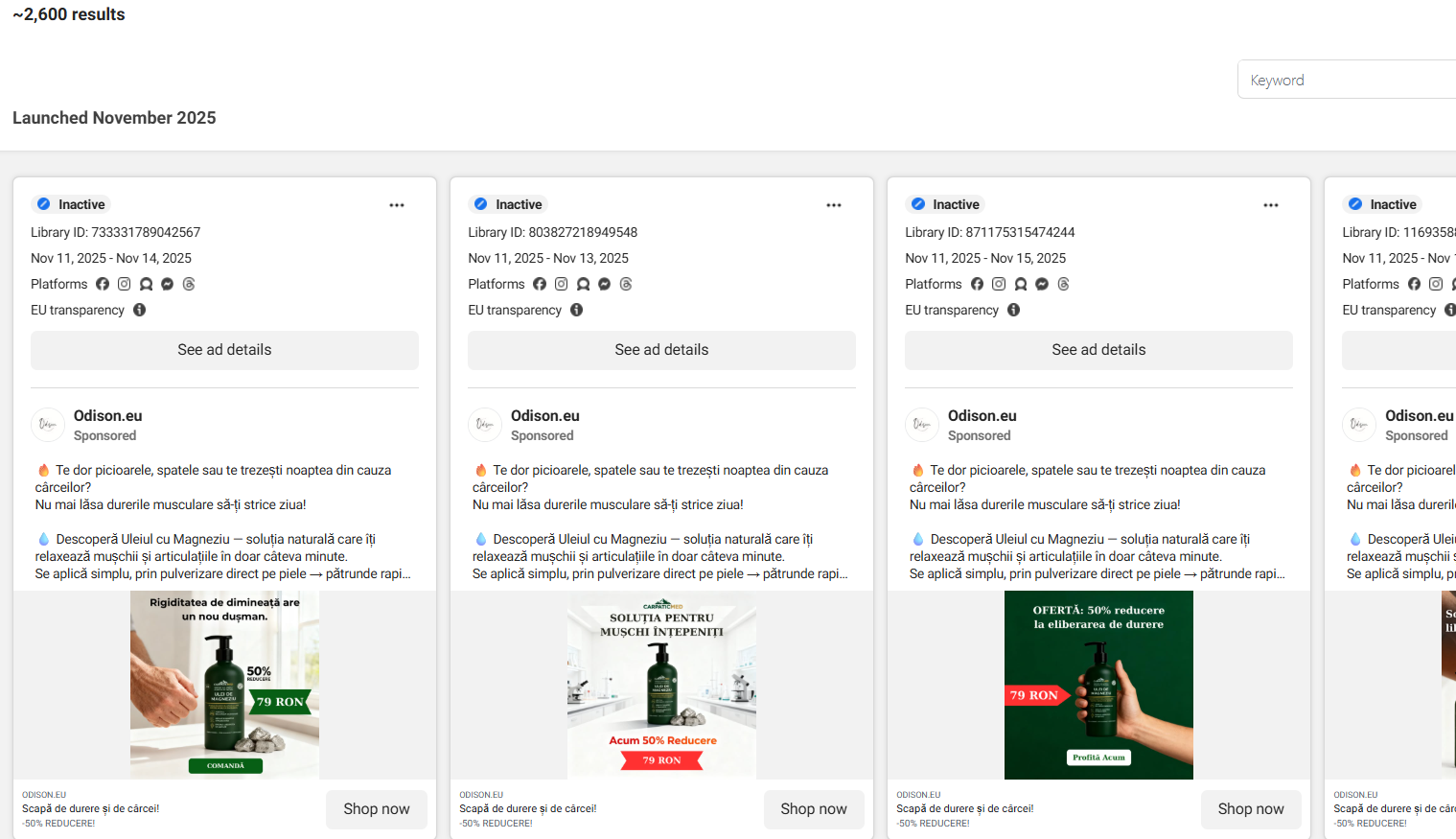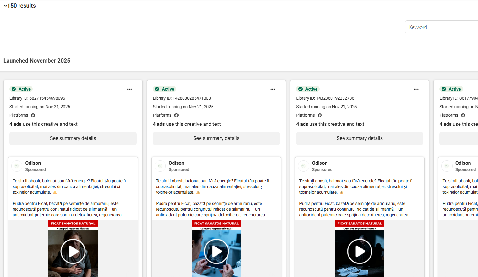 Similar arată și profilul paginii Odison, care a rulat până pe 22 noiembrie aproximativ 1100 de reclame, dintre care circa 150 erau active și la această dată.