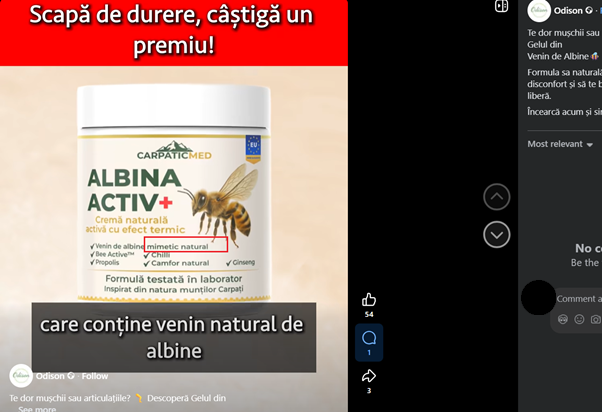 Albina Activ+ a început să fie promovat agresiv pe rețelele de socializare în ultimele luni. Doar pe Facebook există cel puțin trei pagini anonime, denumite Odison.eu, Odison și Odison EU, de pe care au fost sponsorizate, în ultimele luni, circa 5.300 de postări cu imagini și videouri care lăudau efectele „miraculoase” ale unguentului, inclusiv că ar „calma durerile cu venin de albine și efect termic natural, oferind alinare fără pastile sau ingrediente chimice”.