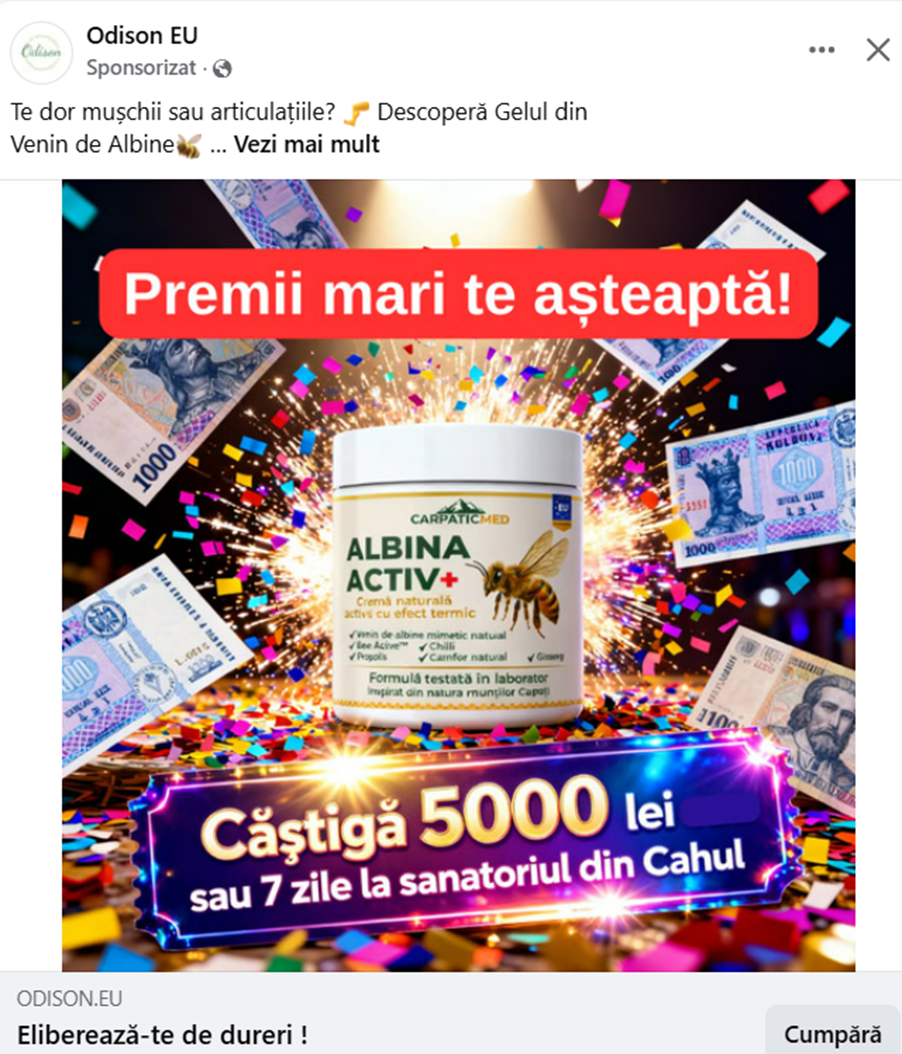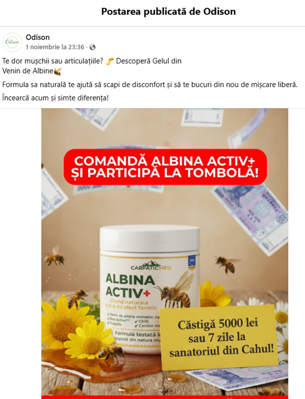 Mai multe preparate despre care se afirmă că au rezultate excelente în combaterea durerilor provocate de diverse afecțiuni sunt promovate agresiv în R. Moldova prin intermediul rețelelor de socializare. Sponsorizările sunt efectuate de pe pagini anonime, nou create, cu denumirea generică Odison. Principalul produs promovat este unguentul Albina Activ+, prezentat a fi „un gel 100% natural cu venin de albine”, care ar lecui durerile de articulații. În realitate, nu este un extras natural de venin de albine, ci despre un compus de laborator care reproduce efectul acestuia. Produsul nu figurează în Nomenclatorul de stat al medicamentelor și pare să vină de pe filiera din România, însă nu este înregistrat oficial nici peste Prut. Campania masivă de vânzări prezintă multiple semne ale unei escrocherii, pe care le vom enumera în acest articol.