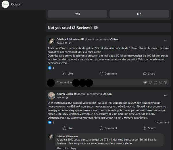 Unicele recenzii de pe aceste pagini de Facebook sunt două comentarii negative lăsate pe pagina Odison, în care două conturi critică atitudinea reprezentanților Odison față de clienți. Unul dintre utilizatori afirmă că i-ar fi fost vândut un produs la un preț mai mare și ar fi încercat în zadar să contacteze reprezentanții Odison pentru a le cere explicații. „Straniu business”, a scris un alt utilizator.