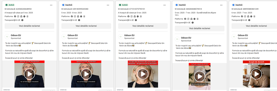 Pagina Odison EU, de exemplu, a început sponsorizările la sfârșitul lunii august. Până la 22 noiembrie, rulase pe Facebook aproximativ 1600 de reclame, potrivit informațiilor companiei Meta.