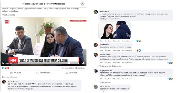 „O mamă nu își poate îmbrățișa copiii, ce se întâmplă? Criminalii recidiviști sunt eliberați, dar oamenii aleși legal sunt băgați la pușcărie”; „În ciuda faptului că Guțul a fost închisă, ea este în continuare bașcana noastră a Găgăuziei și mamă a 2 copii”; „Ca mamă, ca lider, ca simbol al luptei pentru dreptate, ea merită libertate, nu o celulă de închisoare” - sunt câteva dintre zecile de reacții în limba rusă la postarea „Bașcana Găgăuziei Evghenia Guțul rămâne în arest preventiv în penitenciarul nr.13, dar sora ei speră că va fi eliberată curând”, distribuită pe Facebook de redacția NewsMaker.