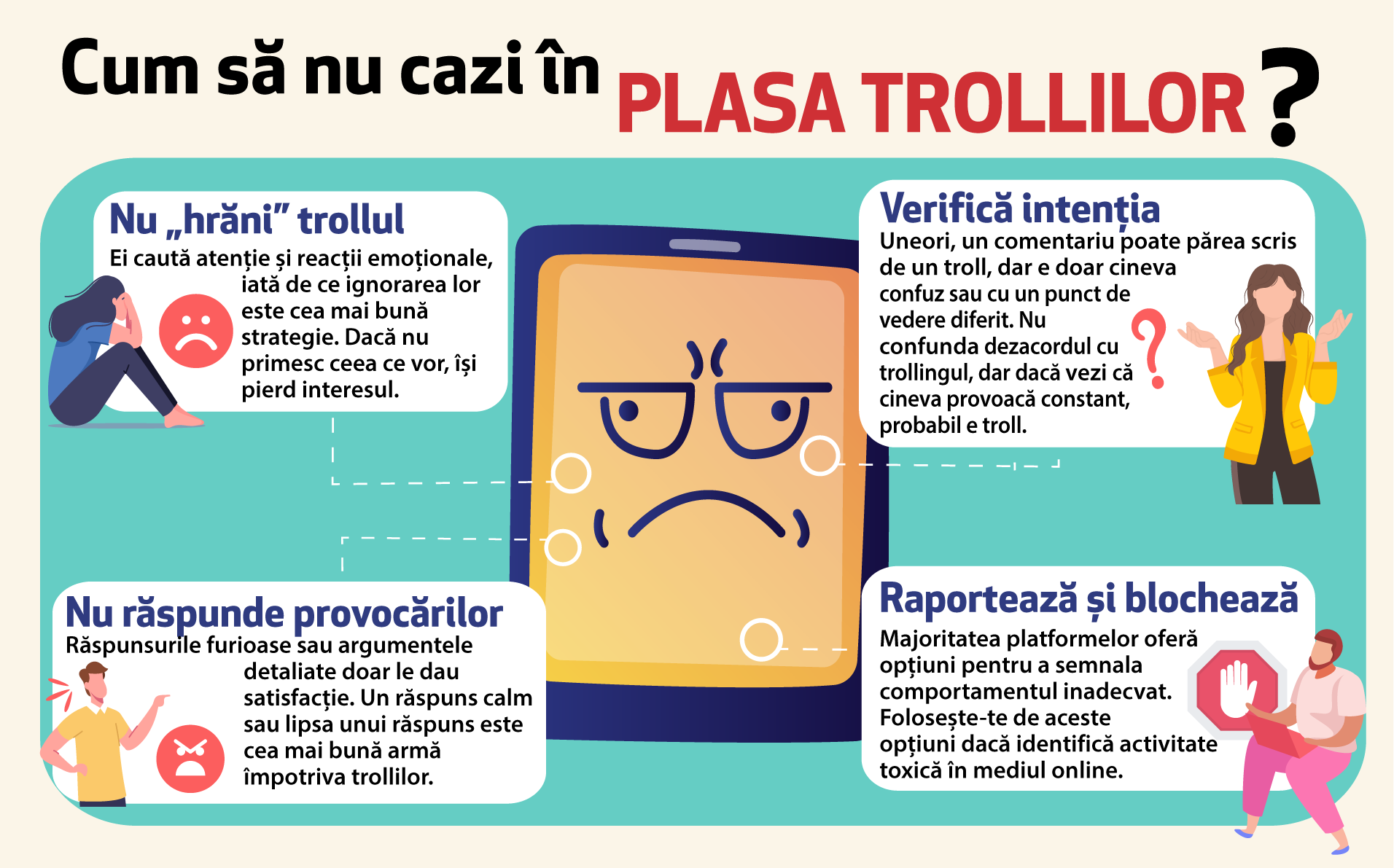 Recunoașterea tacticilor trollilor și evitarea interacțiunii directe sunt cele mai eficiente metode pentru a-i combate. Iar atunci când vine vorba de „fermele de trolli”, este esențial să verifici sursele informațiilor, să nu cazi în capcana manipulării și să promovezi un mediu online mai curat.