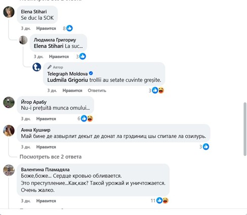 В комментариях к видео пользователи в числе прочего писали, что вот так «Молдова идёт в Европу», «довели страну до предела» и т.д. А тех, кто писал, что яблоки используют для производства сока Telegraph Moldova называли «троллями».
