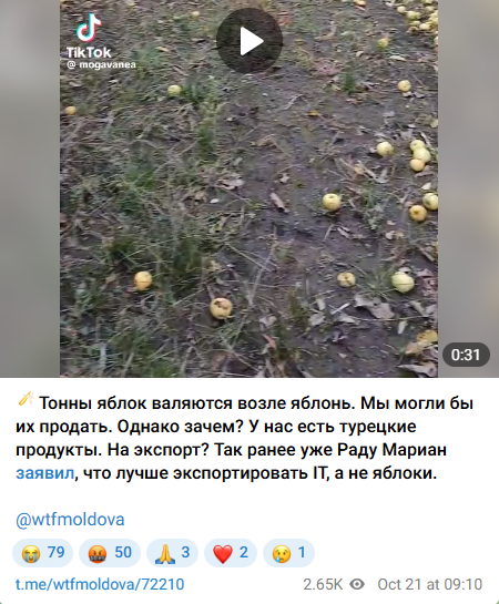 Кроме этого канала, похожие видео о «брошенных» и «никому не нужных» яблоках также появились на странице в Facebook Молдавские Ведомости и в Telegram-канале WTF Moldova?! В некоторых публикациях утверждается, что «яблоки гниют на полях, а фермеры бьют тревогу», и всё это происходит после «разрыва торговых связей с РФ».