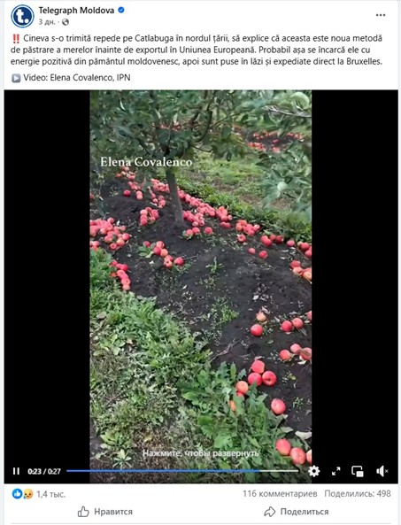В соцсетях распространяются видеоролики, на которых видно, как яблоки лежат на земле в садах, и утверждается, что яблоки никому не нужны и гниют, а фермеры бьют тревогу. На самом деле, это фейк: фермеры используют эти яблоки, в том числе, для производства сока. Ранее такой же фейк распространял Игорь Додон в преддверии парламентских выборов в Молдове.