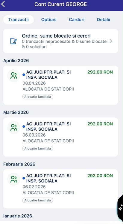 Extras dintr-un cont bancar (aplicația George) care arată plăți lunare regulate ale alocației de stat pentru copii, în valoare de 292 ron, efectuate de Agenția Județeană pentru Plăți și Inspecție Socială Vaslui în lunile februarie–aprilie 2026. Imaginea confirmă că alocațiile continuă să fie achitate.