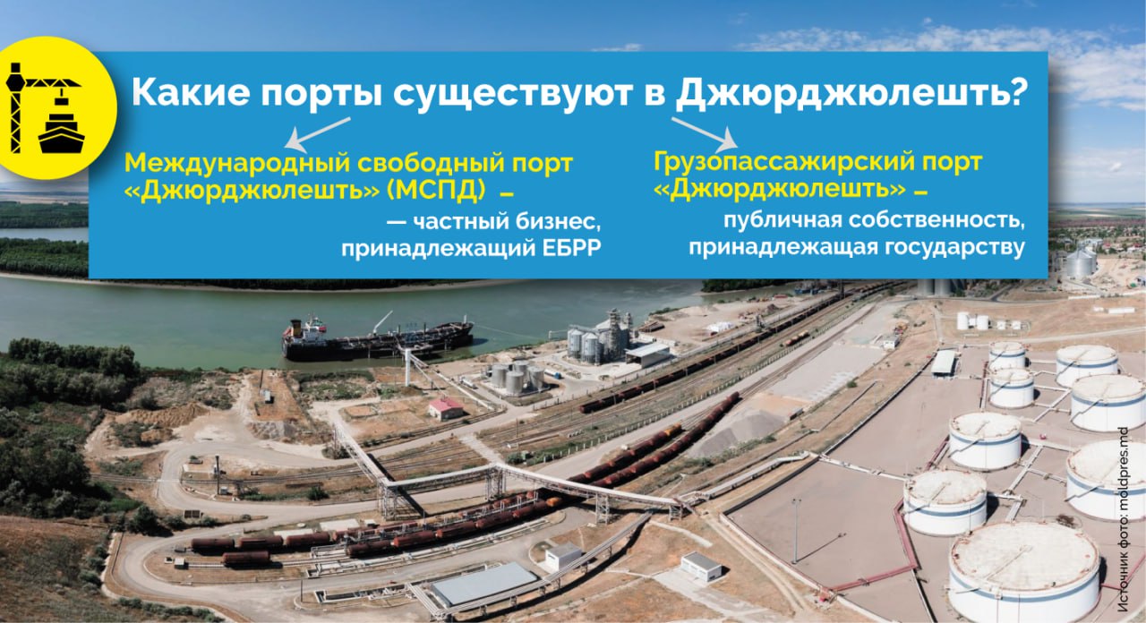Итак, в Республике Молдова есть два порта, которые находятся в месте впадения Прута в Дунай, — МСПД (частный бизнес) и Грузопассажирский порт «Джюрджюлешть» (публичная собственность). Государственный порт на продажу не выставлен и не служит предметом переговоров.