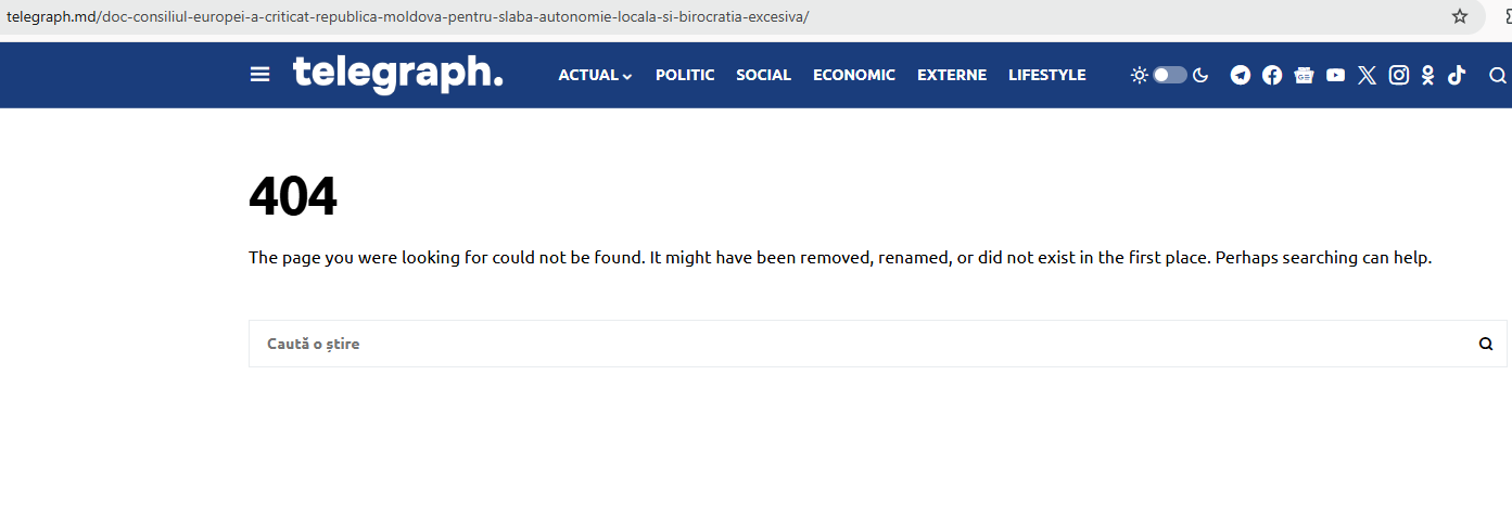 În aceeași zi, site-ul telegraph.md a publicat o știre intitulată „Consiliul Europei a criticat Republica Moldova pentru slaba autonomie locală și birocrația excesivă”, în care a scos în evidență aspectele negative din raport.