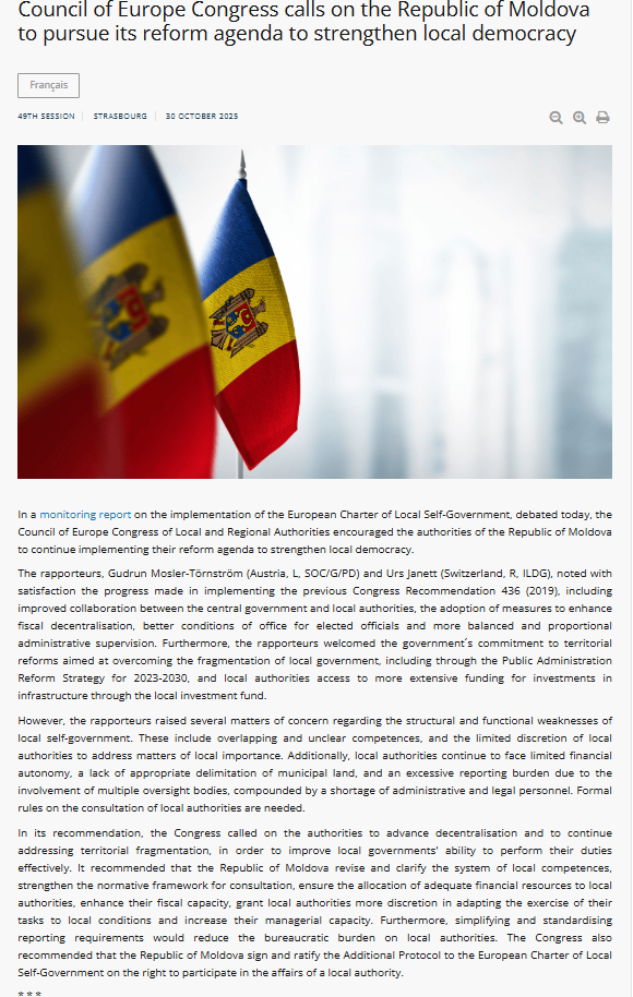 Este vorba despre raportul de monitorizare privind implementarea Cartei Europene a Autonomiei Locale de către R. Moldova, prezentat la Strasbourg joi, 30 octombrie, de Congresul Autorităților Locale și Regionale al Consiliului Europei.