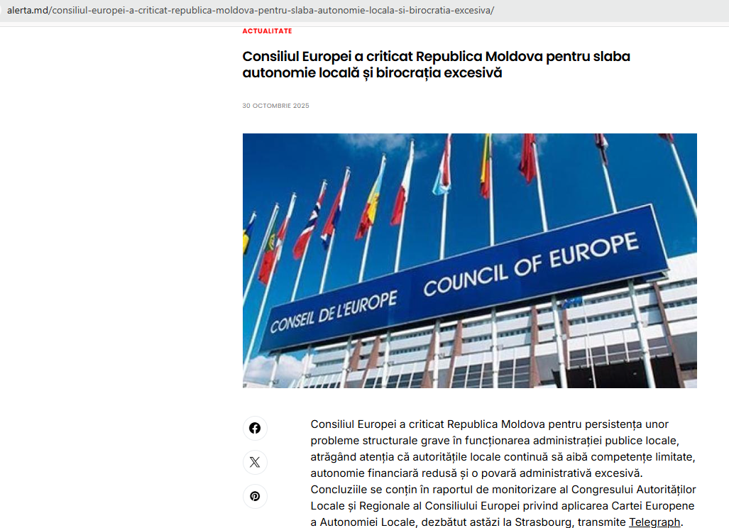 Mai multe site-uri și canale de social media au distorsionat conținutul unui raport al Consiliului Europei (CE) privind autonomia locală în R. Moldova, transformând un document echilibrat într-un mesaj fals de critică dură la adresa autorităților moldovene.